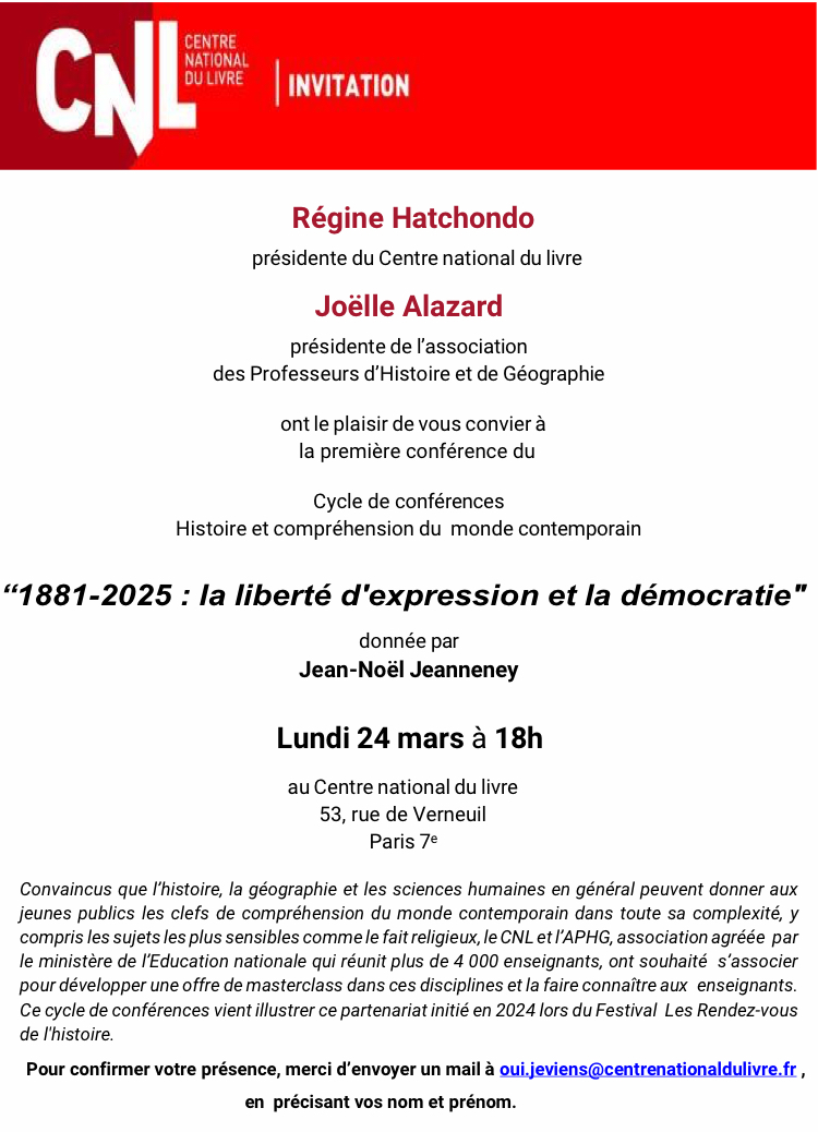 « 1881-2025 : la liberté d’expression et la démocratie » – conférence de Jean-Noël Jeanneney, le 24 mars 2025 au Centre national du Livre, 53 rue de Verneuil (Paris, VIIe)