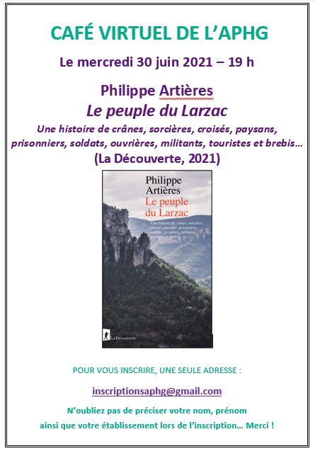 • Le mardi 29 juin à 18h30, l’APHG clôturera le cycle des cafés virtuels de la saison 2020-2021 en recevant François Bon et Yann Potin qui traiteront de « L’invention de la Préhistoire ». Pour s’inscrire : inscriptionsaphg@gmail.com.