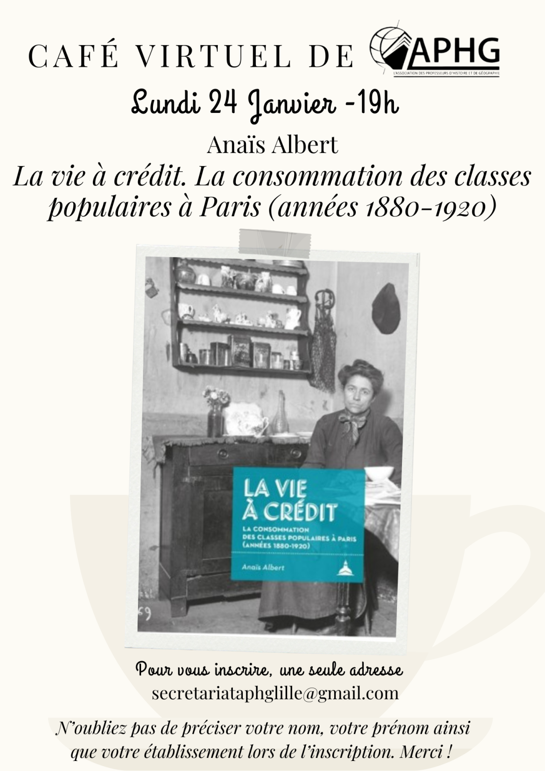 Le 24 janvier 2022, le café virtuel de l’APHG recevait Anaïs Albert qui présentait son ouvrage La vie à crédit. La consommation des classes populaires à Paris (années 1880-1920).