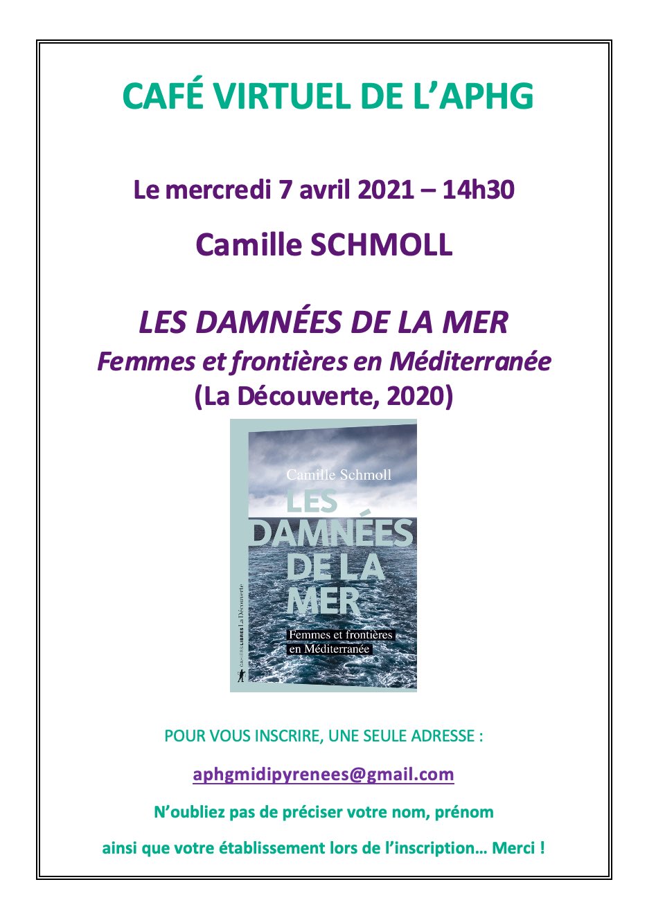 Le 12 avril 2021, l’APHG Midi-Pyrénées recevait dans le café virtuel Camille Schmoll 1 qui présentait son ouvrage Les damnées de la mer. Femmes et frontières en Méditerranée, paru à La Découverte en 2021. Présentation / discussion par Philippe Sierra, Président de la régionale Midi-Pyrénées.