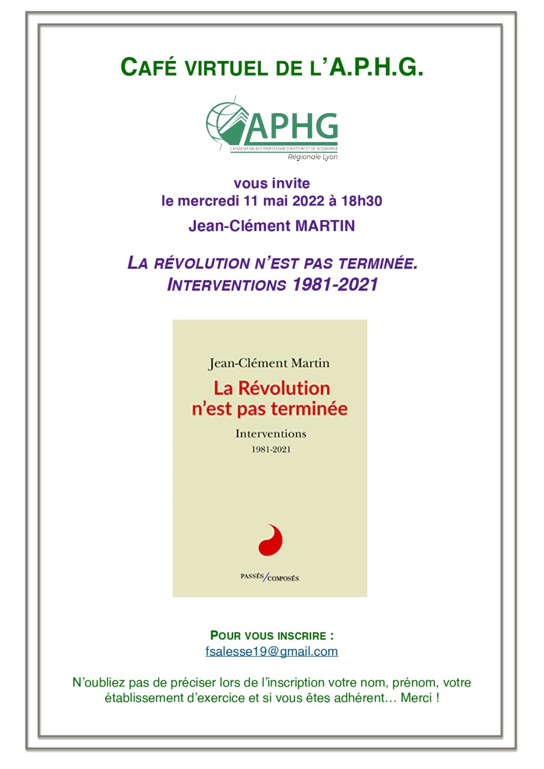 Le 11 mai 2022, la régionale de Lyon recevait dans le café virtuel de l’APHG Jean-Clément Martin autour de l’ouvrage La Révolution n’est pas terminée. Interventions 1981-2021. L’échange était animé par Fabien Salesse.