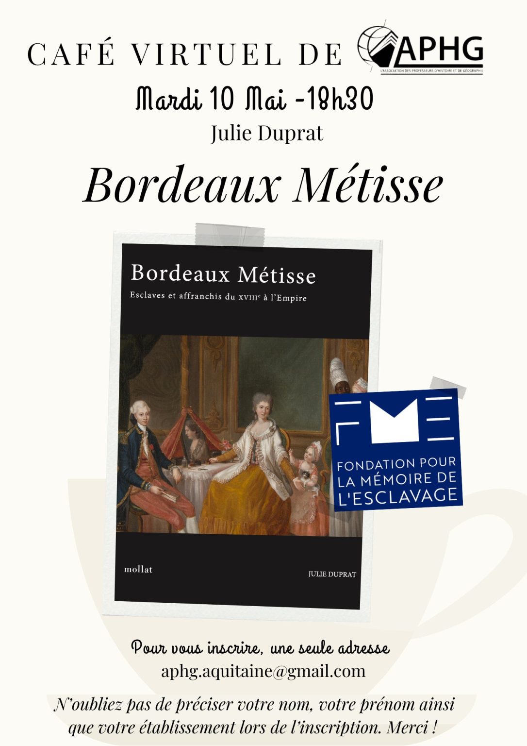 Le 10 mai 2022, la régionale Aquitaine de l’APHG, en partenariat avec la Fondation pour la Mémoire de l’Esclavage, recevait Julie Duprat pour son ouvrage Bordeaux Métisse.