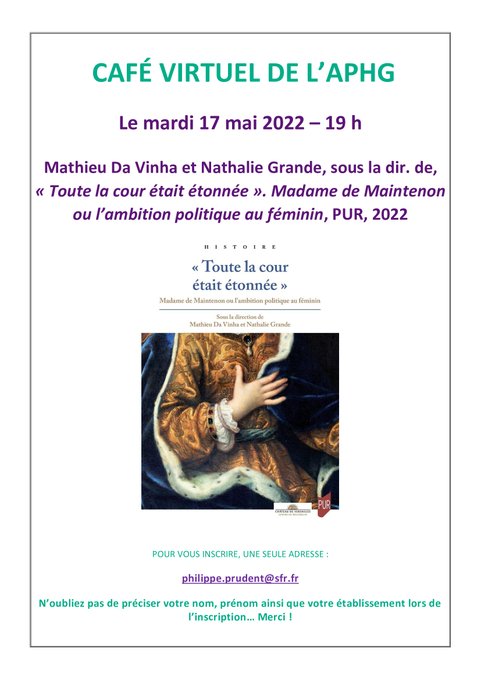 Le 17 mai 2022, la régionale de Lyon recevait, dans le café virtuel de l’APHG, Mathieu Da Vinha et Nathalie Grande autour de l’ouvrage Toute la cour était étonnée. Madame de Maintenon ou l’ambition politique au féminin.