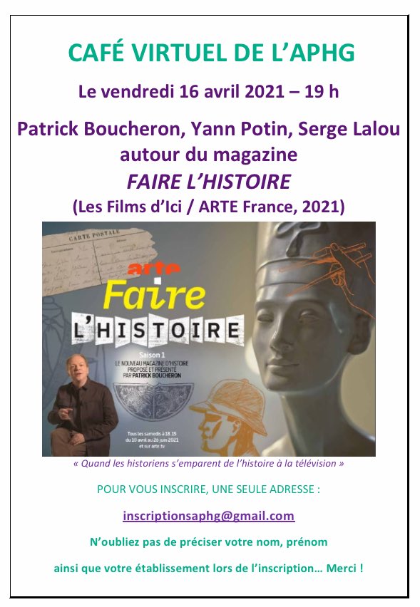 Le 16 avril 2021, les historiens Patrick Boucheron et Yann Potin, et le producteur Serge Lalou (Les Films d’Ici) étaient les invités du café virtuel de l’APHG où ils ont présenté l’émission « Faire l’Histoire » diffusée sur Arte. L’échange était animé par Joëlle Alazard et François da Rocha Carneiro. Ce café est à réécouter ci-dessous en version audio.