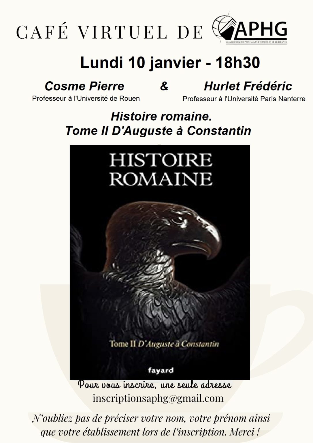 Le 10 janvier 2022, le café virtuel de l’APHG recevait Pierre Cosme et Frédéric Hurlet qui présentaient le tome II d’Histoire romaine, qui concerne la période « d’Auguste à Constantin », paru chez Fayard. L’échange était animé par Noémie Lemennais.