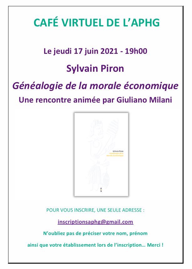 Le 17 juin 2021, le café virtuel de l’APHG recevait Sylvain Piron sur Généalogie de la morale économique (Zones sensibles, 2020), dans un échange avec Giulano Milani.