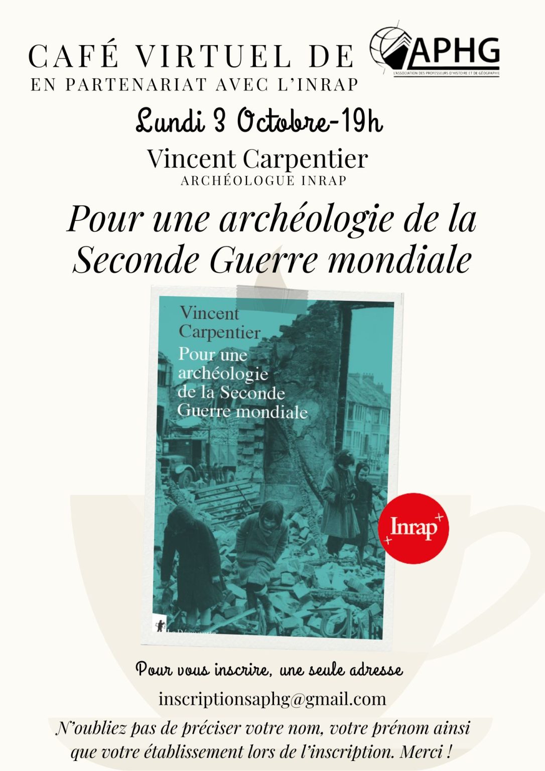 – Le lundi 3 octobre à 19h, nous recevrons, en collaboration avec l’INRAP, l’archéologue Vincent Carpentier, auteur de Pour une archéologie de la Seconde Guerre mondiale. Pour s’inscrire : inscriptionsaphg@gmail.com