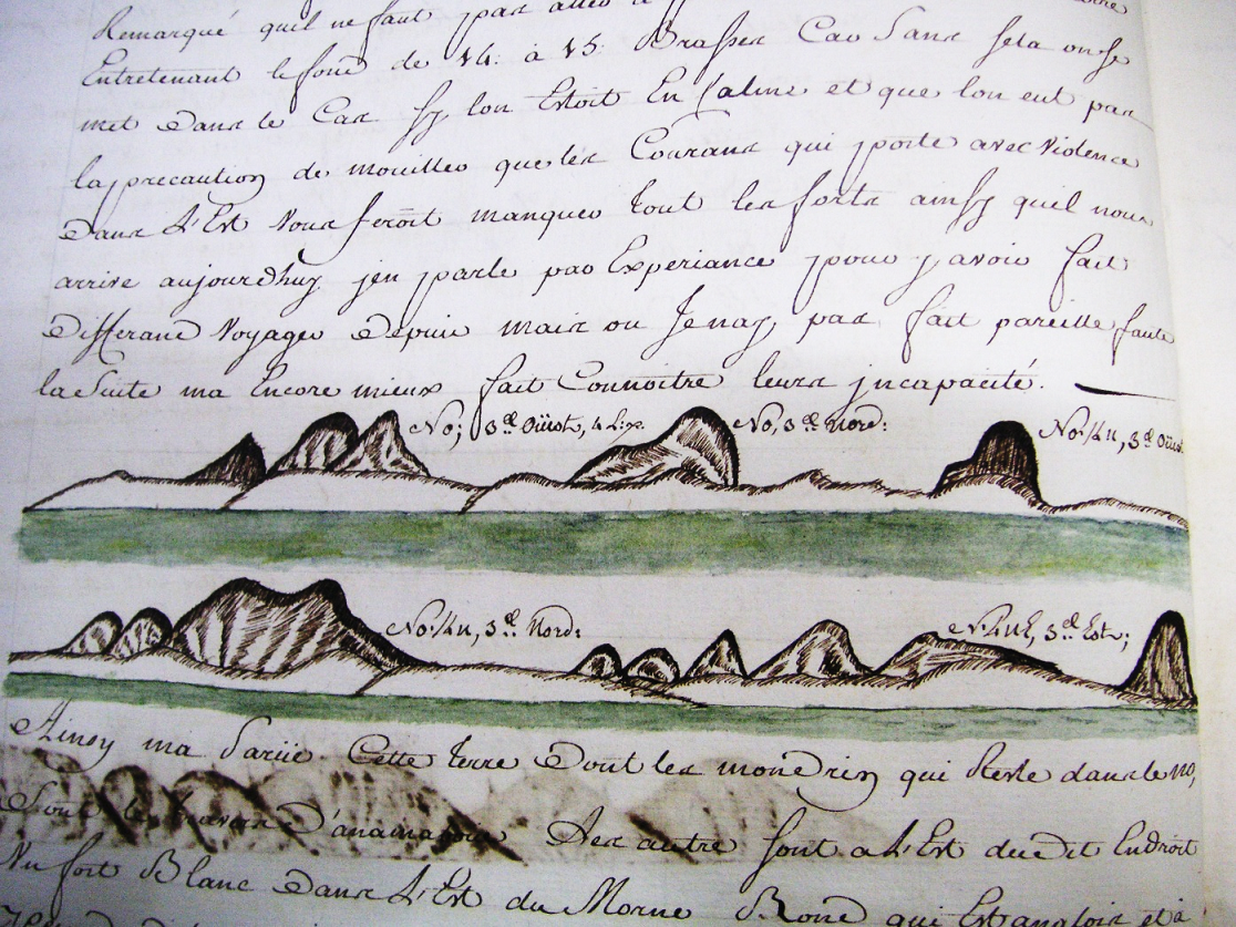 Pas de beau journal de bord sans quelques amers, dont certains rehaussés de couleurs. Ces relevés graphiques des côtes permettent de suivre la navigation du bâtiment qui a quitté Lorient et navigue le long des côtes ouest-africaines, jusqu’aux lieux de traite. Pour certaines campagnes, nous n’avons, il est vrai, que des « extraits » de journaux dont on n’a visiblement retenu que les mesures, descriptions, dessins, voire levés sommaires des côtes. Ces copies et extraits divers ont alors été exécutés bien après la campagne elle-même, dans la mesure où ils pouvaient servir à améliorer les cartes marines utilisées pour les expéditions maritimes de nature commerciale (et pas seulement de traite) ou navale.