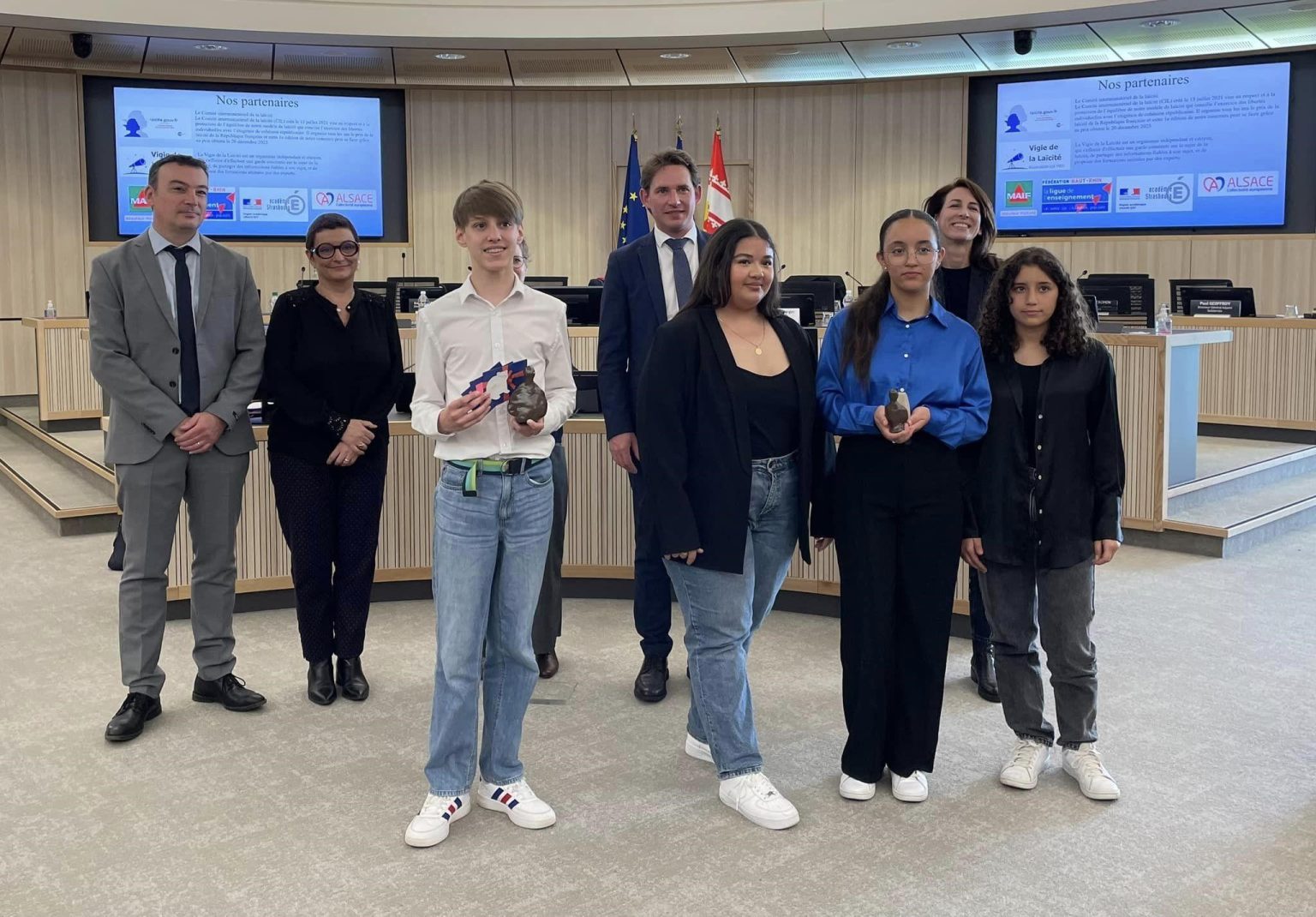 Les finalistes se sont retrouvés dans la salle de l’assemblée de la Collectivité européenne d’Alsace à Colmar le 16 mai 2024. Trois élèves de 4e du collège André Léotard de Fréjus et un élève de 4e du collège Grégoire de Tours de Marlenheim avaient été sélectionnés dans la catégorie collège.