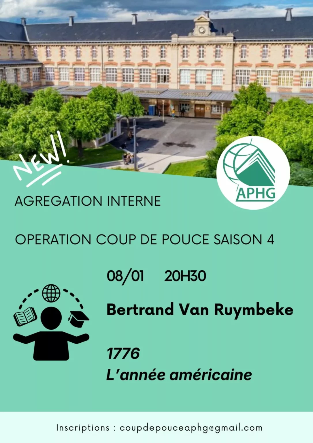 Opération coup de pouce pour préparer l’Agrégation interne organisée par l’APHG pour ses adhérents de l’année 2025-2026 sous la forme de conférences et de séances de méthodologie des épreuves. Vous pouvez retrouver sur cette page une séance de Bertrand Van Ruymbeke pour la présentation de son ouvrage à paraître prochainement : 1776. L’année américaine. Vous retrouverez également sur cette page des ressources proposées par notre intervenant. Pour vous inscrire au dispositif, une seule adresse : coupdepouceaphg@gmail.com Vous pouvez télécharger la présentation de l’ouvrage en cliquant sur la vignette ci-dessous : 1776_l_anne_e_ame_ricaine