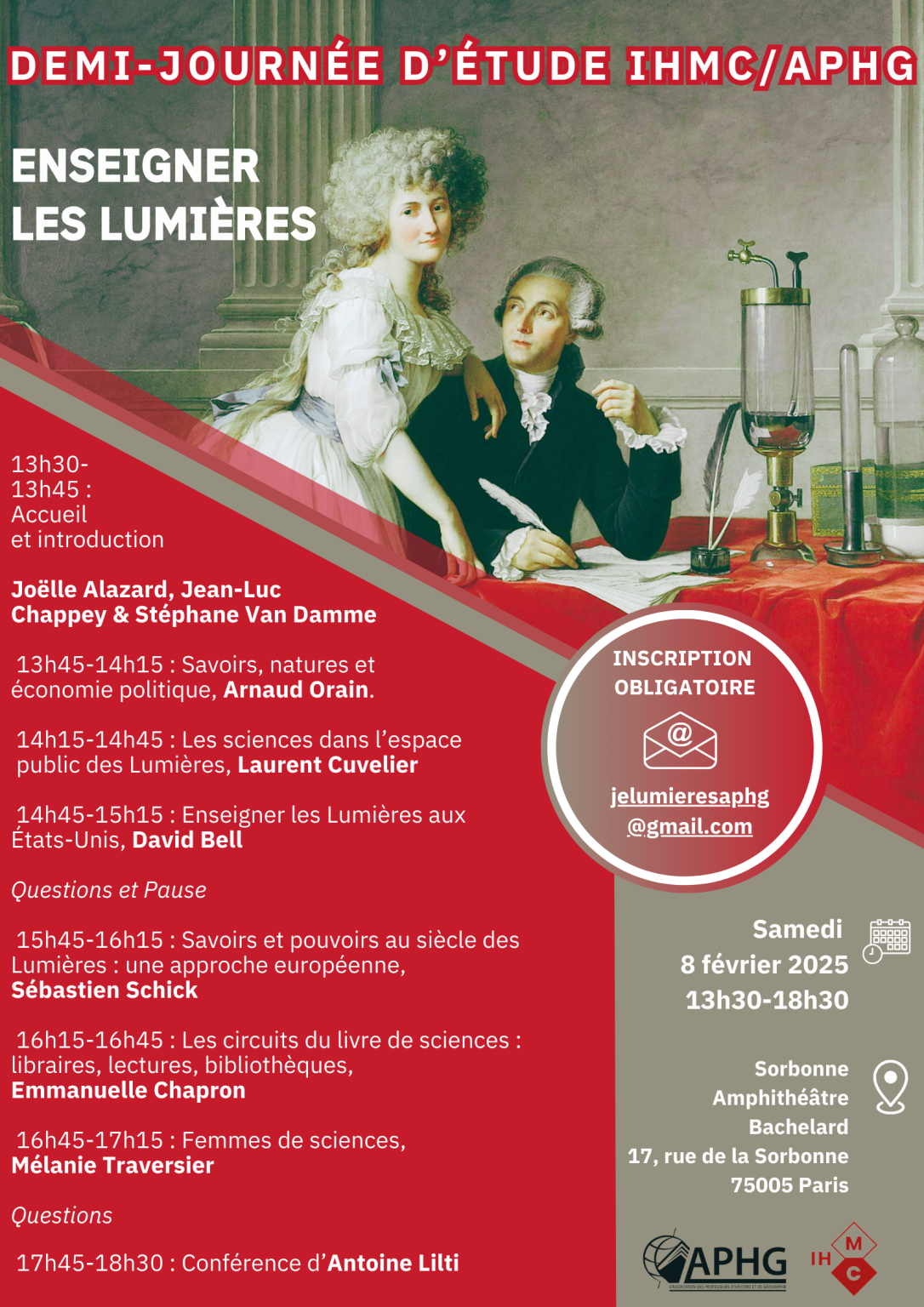 L’APHG, en partenariat avec l’IHMC, organise une demi-journée d’étude sur le thème « Enseigner les Lumières », le samedi 8 février 2025, à la Sorbonne (Amphithéâtre Bachelard).