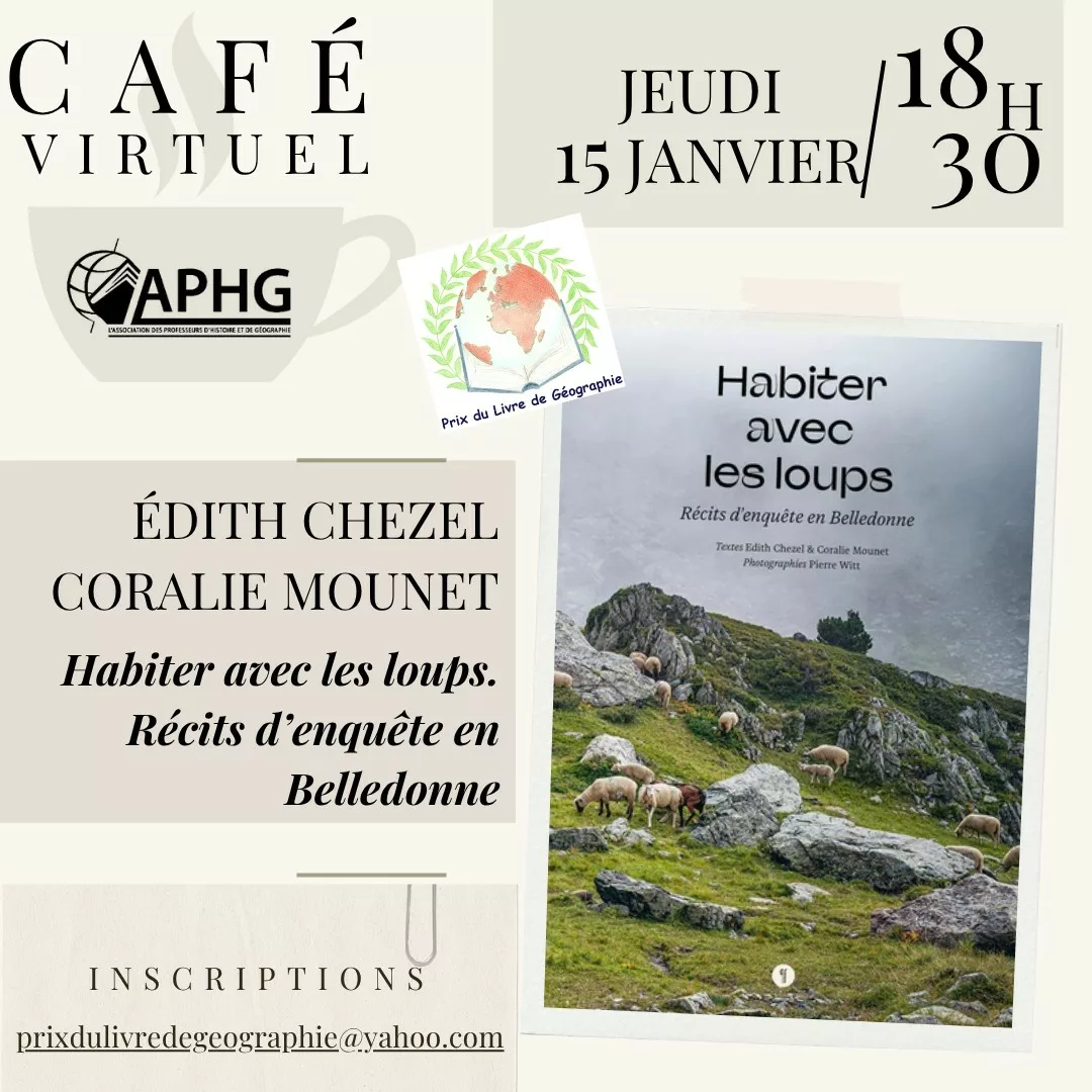 Le café virtuel a reçu Édith Chezel et Coralie Mounet le 15 janvier 2026 pour la présentation de l’ouvrage Habiter avec les loups. Récits d’enquête en Belledonne dans le cadre du cycle du Prix du Livre de Géographie des lycéens et des étudiants.