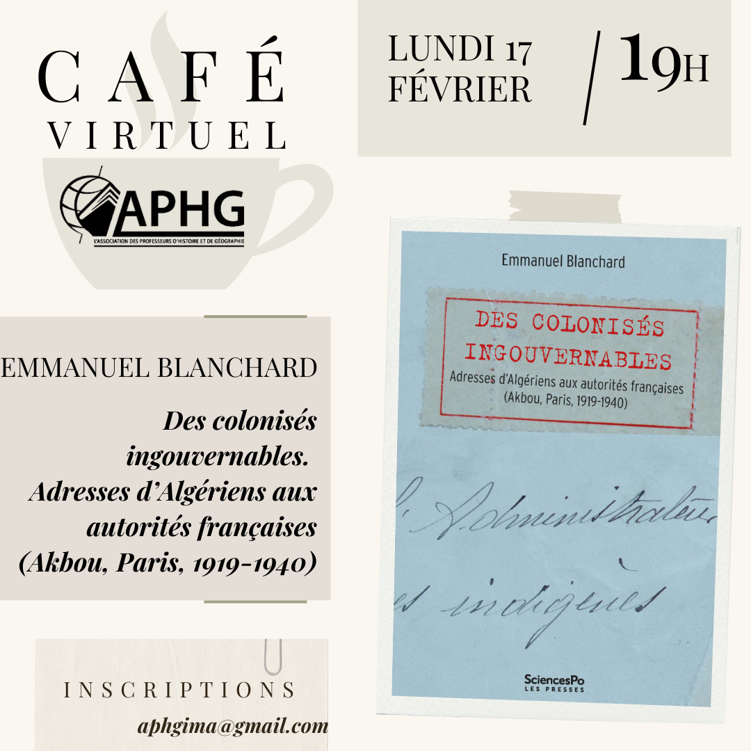 Le café virtuel a reçu Emmanuel Blanchard le 17 février 2025 pour la présentation de son ouvrage Des colonisés ingouvernables. Adresses d’Algériens aux autorités françaises (Akbou, Paris, 1919-1963).