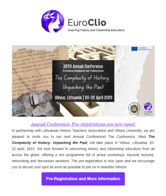 L’APHG est membre du réseau international de professeurs d’histoire EUROCLIO, et à ce titre, souhaite partager avec vous l’infolettre des actualités d’Euroclio, que nous recevons. Vous pouvez aussi vous inscrire individuellement à cette infolettre sur le site d’Euroclio.