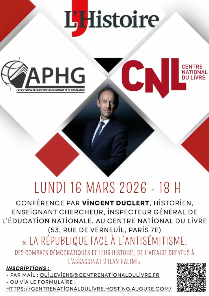 Cette conférence propose une traversée de l’histoire longue de l’antisémitisme en France et des résistances qu’il a suscitées au sein de la République. De la mobilisation des dreyfusards à la fin du XIXe siècle jusqu’au meurtre d’Ilan Halimi en 2006, Vincent Duclert interroge la capacité de la démocratie française à reconnaître, nommer et combattre cette forme de haine. Une réflexion historique et civique d’une brûlante actualité.