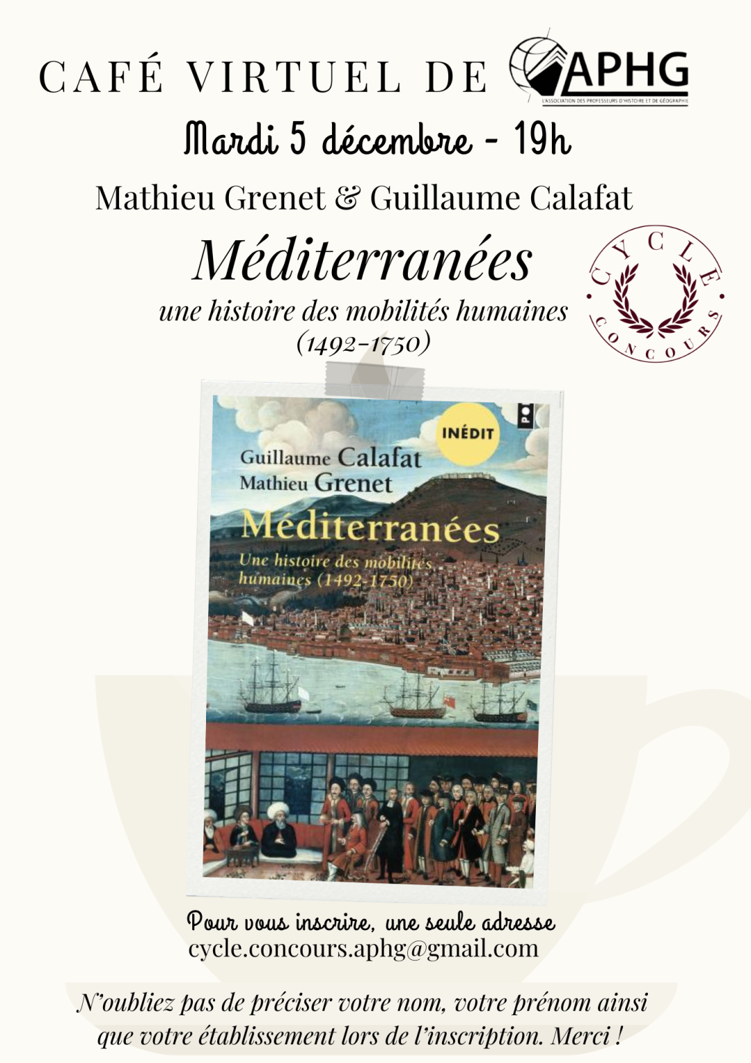 Le café virtuel a reçu Guillaume Calafat et Mathieu Grenet le 5 décembre 2023 pour la présentation de leur ouvrage Méditerranées. Une histoire des mobilités humaines (1492-1750) dans le cadre du Cycle concours.