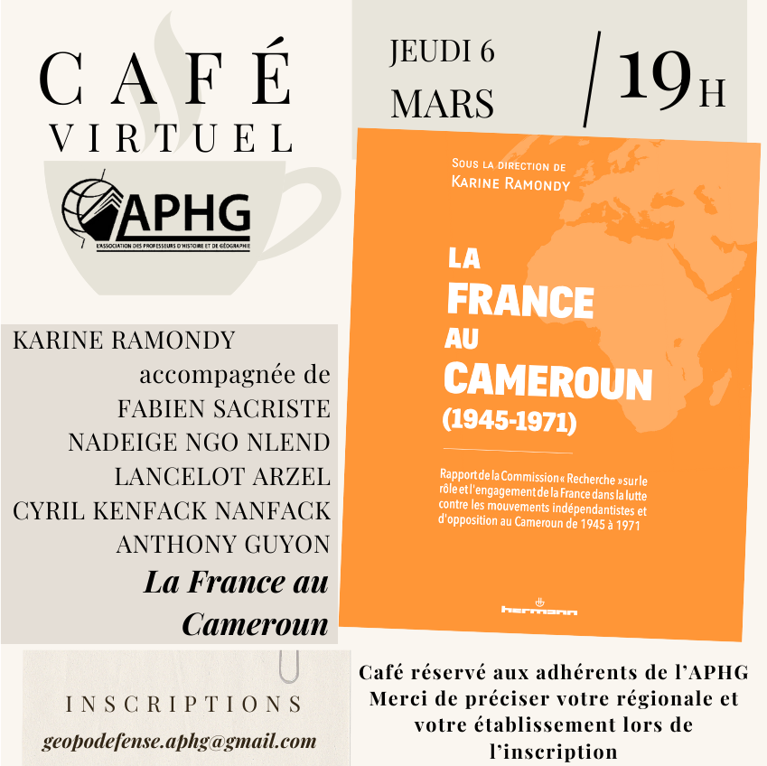 Le café virtuel a reçu Karine Ramondy, accompagnée de Fabien Sacriste, Nadeige Ngo Nlend, Lancelot Arzel, Cyril Kenfack Nanfack et Anthony Guyon le 6 mars 2025 pour la présentation du rapport consacré à La France au Cameroun (1945-1971).