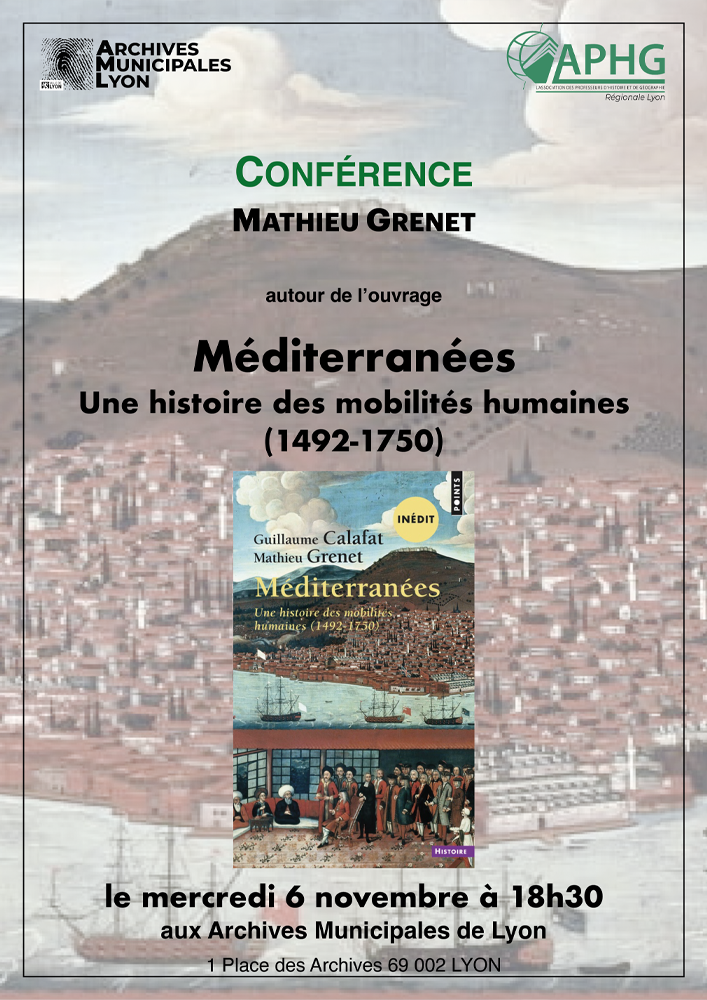 Cette discussion avec Mathieu Grenet autour de l’ouvrage coécrit avec Guillaume Calafat, Méditerranées. Une histoire des mobilités humaines (1492-1750), Paris, Seuil, 2023 a été enregistrée le mercredi 6 novembre 2024 dans le cadre du cycle de conférences organisé par la régionale APHG de Lyon en partenariat avec les Archives Municipales.