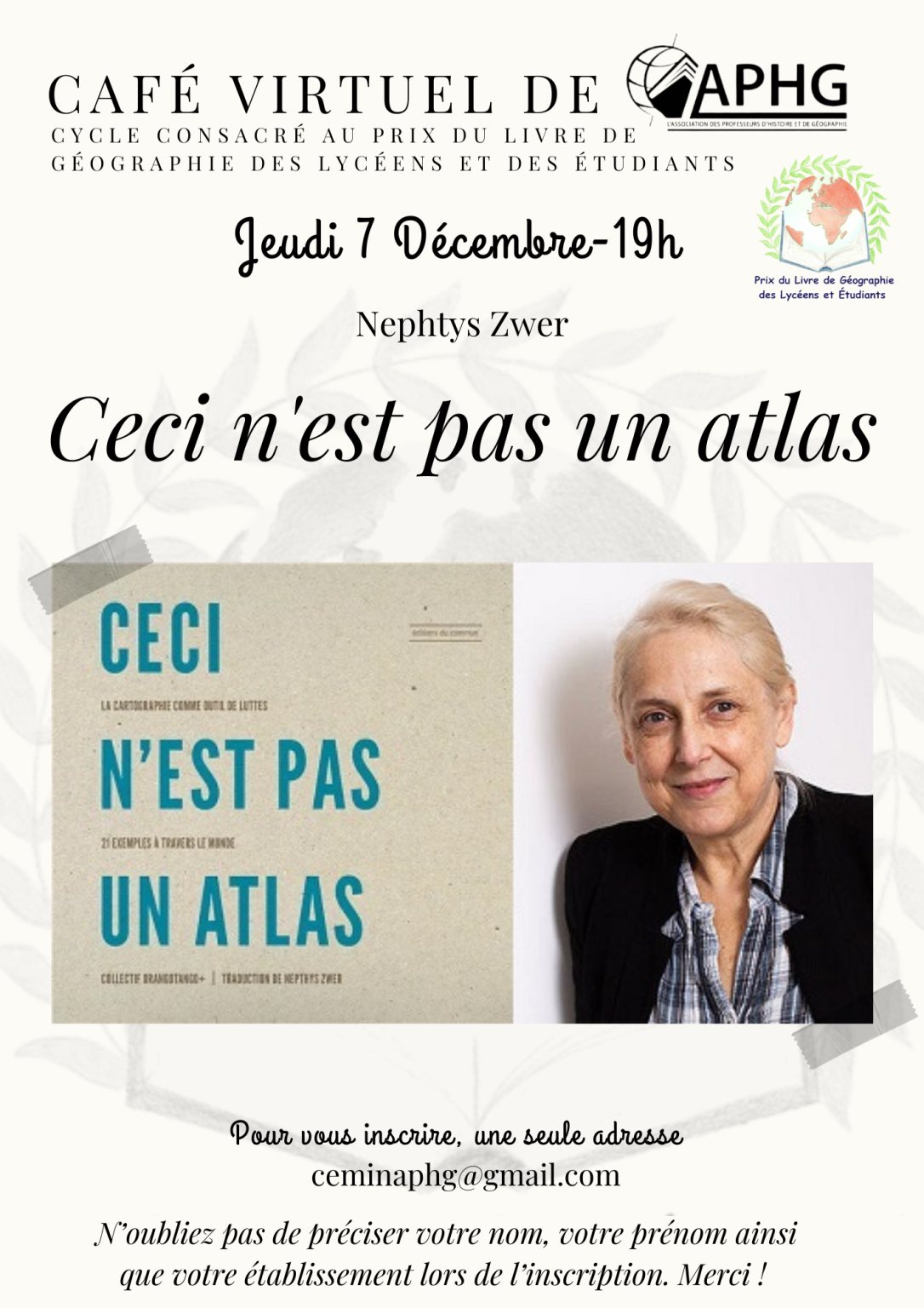 Le café virtuel a reçu Nephtys Zwer le 7 décembre 2023 pour la présentation de l’ouvrage Ceci n’es pas un atlas dans le cadre du cycle du prix du livre de Géographie des lycéens et des étudiants.