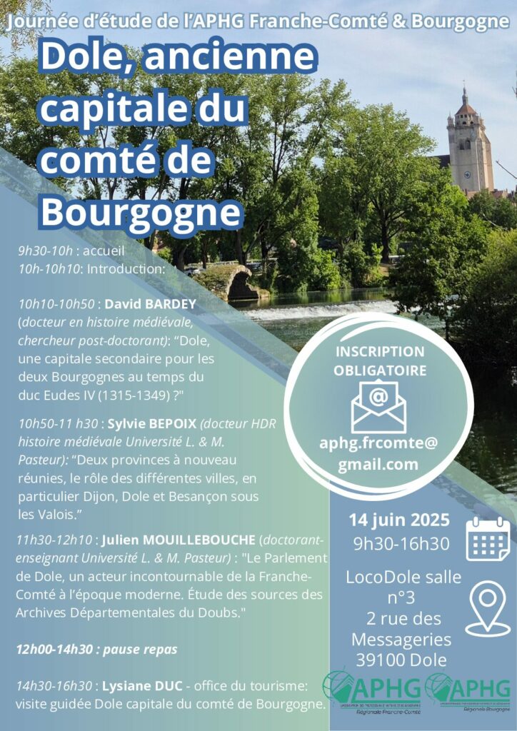 10h10-10h50 : David BARDEY (docteur en histoire médiévale, chercheur post-doctorant): “Dole, une capitale secondaire pour les deux Bourgognes au temps du duc Eudes IV (1315-1349) ? »