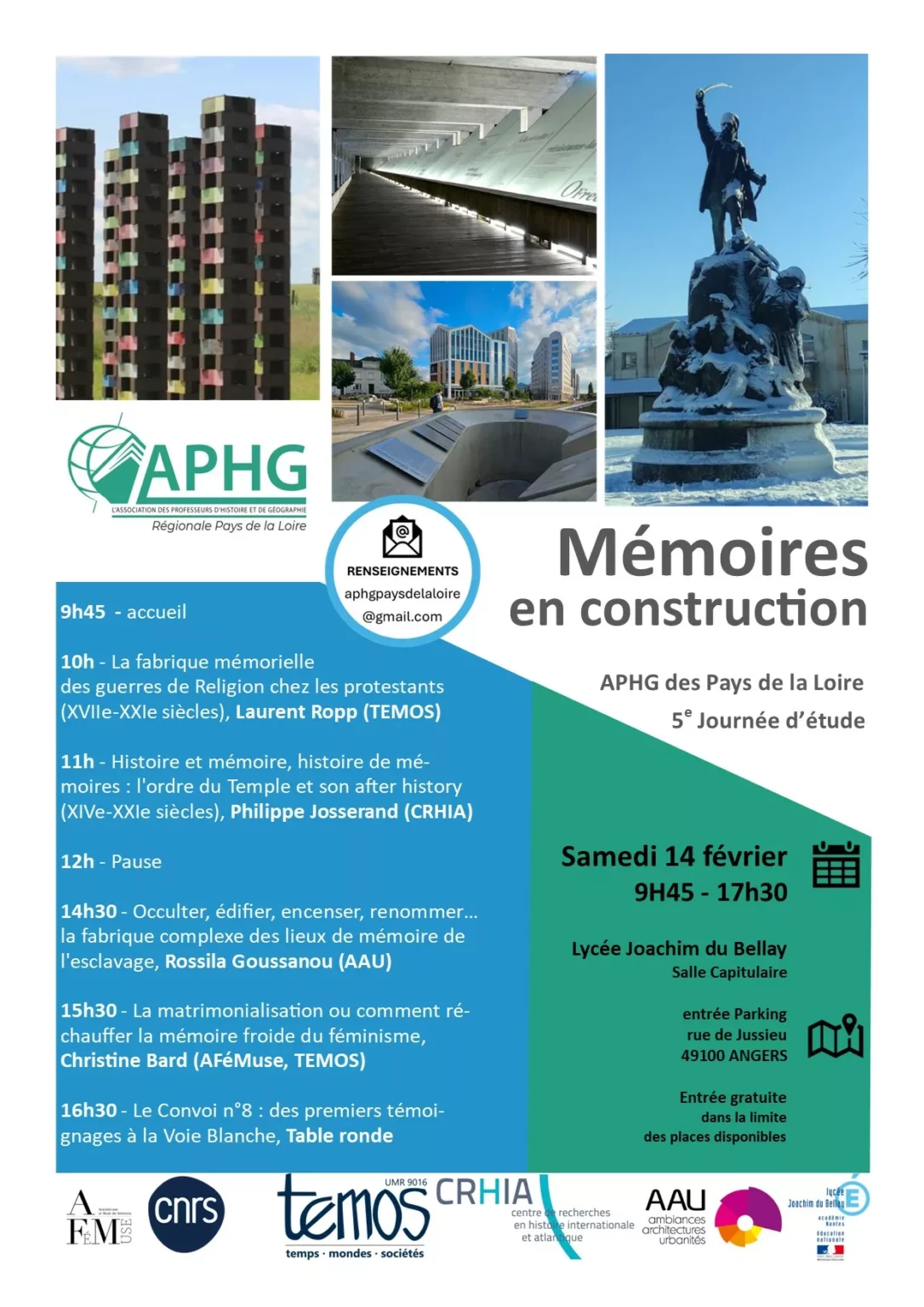 Réchauffer la mémoire froide des féminismes avec Christine Bard ; comprendre les enjeux des lieux de mémoire de l’esclavage avec 𝐑𝐨𝐬𝐬𝐢𝐥𝐚 𝐆𝐨𝐮𝐬𝐬𝐚𝐧𝐨𝐮 ; analyser les secrets (im)mémoriaux des Templiers de Druon aux Mangas en passant par la Norvège, en compagnie de 𝐏𝐡𝐢𝐥𝐢𝐩𝐩𝐞 𝐉𝐨𝐬𝐬𝐞𝐫𝐚𝐧𝐝 ; suivre la mémoire des Guerres de religion du XVe à nos jours avec 𝐋𝐚𝐮𝐫𝐞𝐧𝐭 𝐑𝐨𝐩𝐩 ; être impressionné enfin par la capacité de nos élèves à faire vivre collectivement la mémoire de la Shoah à travers une table ronde animée par 𝐁𝐞𝐫𝐭𝐫𝐚𝐧𝐝 𝐁𝐨𝐬𝐬𝐲 (avec Régine Podorowski, 𝐀𝐥𝐚𝐢𝐧 𝐉𝐚𝐜𝐨𝐛𝐳𝐨𝐧𝐞, Michel Letertre, les associations 𝐂𝐨𝐧𝐯𝐨𝐢 𝐧°𝟖 et Association 1. COM1 et des élèves). C’était la 5ième journée d’étude de APHG Pays de la Loire ! merci à toutes et à tous !