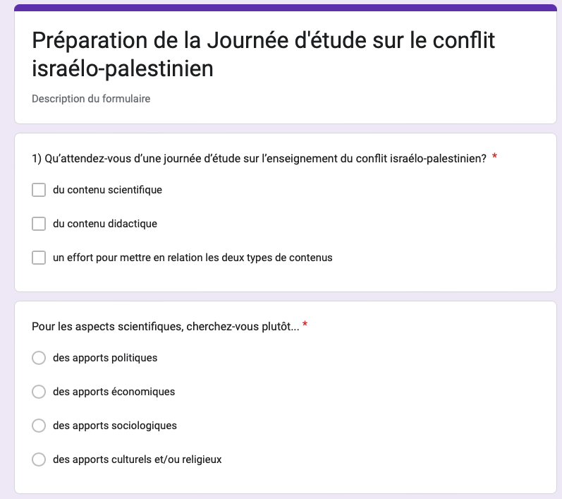 Nous vous adressons ce questionnaire en vue d’une journée d’étude qui sera bientôt organisée sur le conflit israélo-palestinien. Merci pour vos réponses!