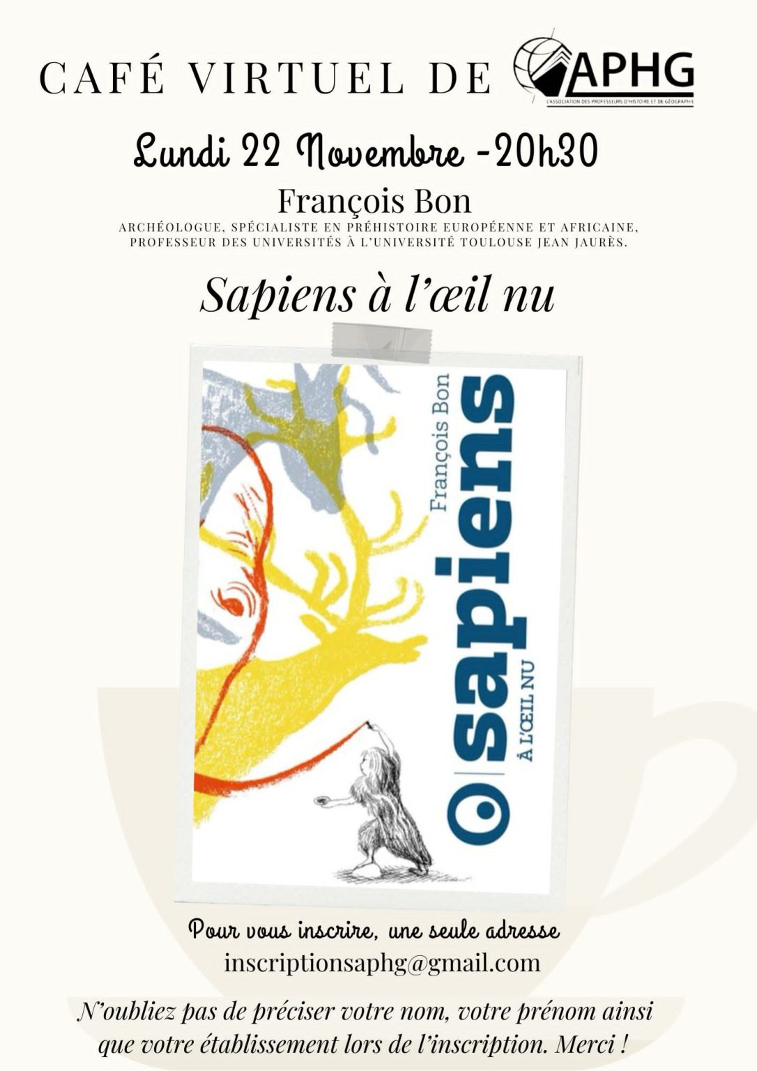 – A 20h30, l’APHG Lille recevra le préhistorien François Bon pour son livre Sapiens à l’oeil nu; à vos claviers, rejoignez-nous sur inscriptionsaphg@gmail.com