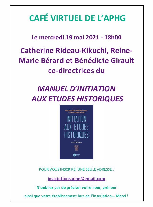 • Le mercredi 19 mai à 18h, l’APHG NPDC vous propose une rencontre avec Catherine Rideau-Kikuchi, Reine-Marie Berard & Bénédicte Girault pour leur Manuel d’Initiation aux Études Historiques. Pour s’inscrire : inscriptionsaphg@gmail.com.