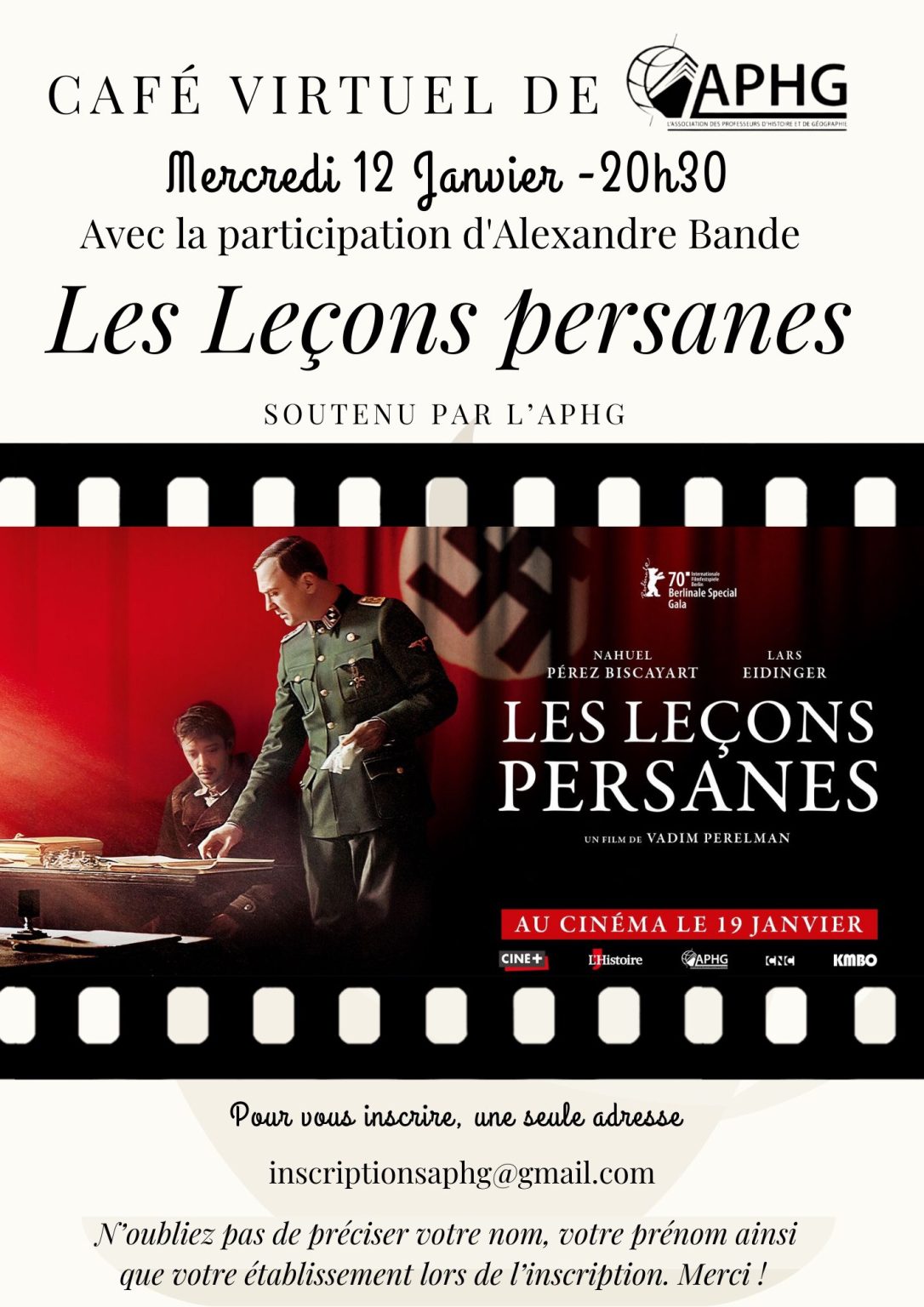 Le 12 janvier 2022, le café virtuel recevait Alexandre Bande autour du film Les Leçons persanes, soutenu par l’APHG.