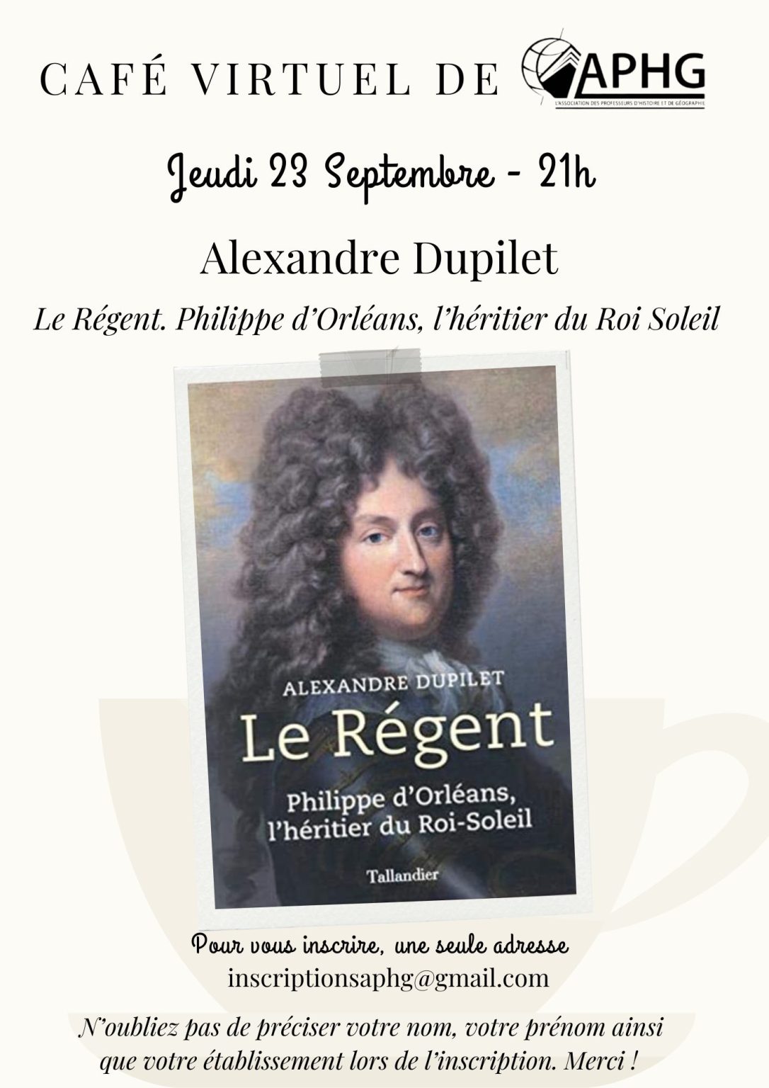Le 23 septembre 2021, l’APHG accueillait Alexandre Dupilet pour son livre Le Régent. Philippe d’Orléans, héritier du Roi Soleil (Tallandier, 2020).
