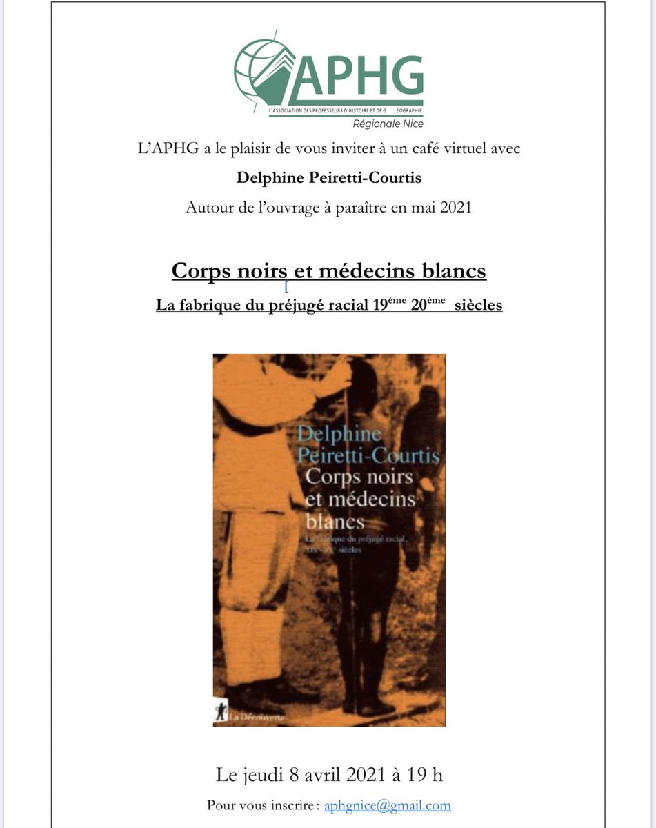 Le 8 avril 2021, l’APHG-Nice recevait dans le café virtuel Delphine Peiretti-Courtis pour son ouvrage Corps noirs et médecins blancs. La fabrique du préjugé racial, XIXe-XXe s. (La Découverte, 2021). L’échange était animé par Gratianne Zucca, Vice-Présidente de la Régionale de Nice.