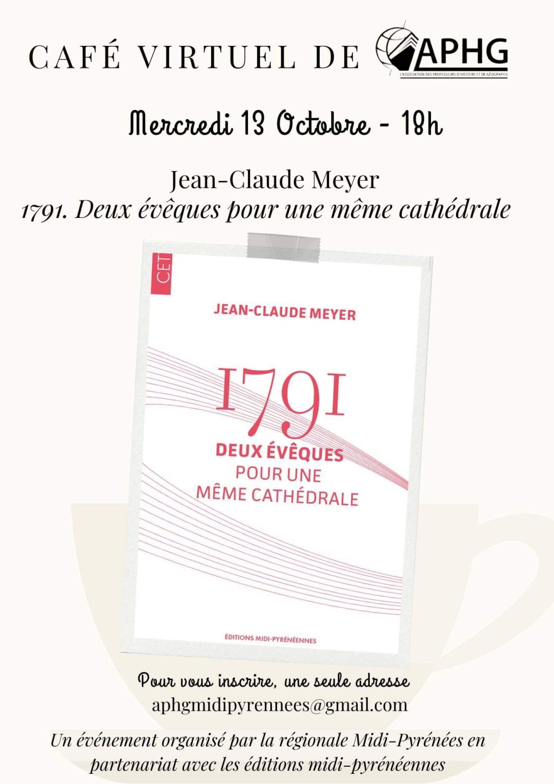 Le 13 octobre 2021, l’APHG Midi-Pyrénées recevait dans le café virtuel Jean-Claude Meyer pour son ouvrage 1791 : deux évêques pour une même cathédrale, paru aux Editions Midi-Pyrénéennes, dans la collection « Cette année-là à Toulouse ».