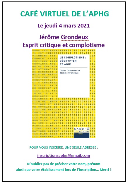 Le 4 mars 2021, l’atelier citoyenneté de l’APHG recevait dans le café virtuel Jérôme Grondeux pour un échange sur l’esprit critique, animé par Christine Guimonnet.