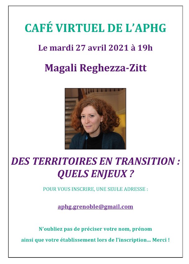 Le 27 avril 2021, la régionale de Grenoble de l’APHG recevait dans le café virtuel Magali Reghezz-Zitt pour évoquer les enjeux des territoires en transition. Ce café – modèle hybride entre la visioconférence en public et l’entretien – était très stimulant et permettait de réfléchir sur une notion centrale du nouveau programme de lycée.