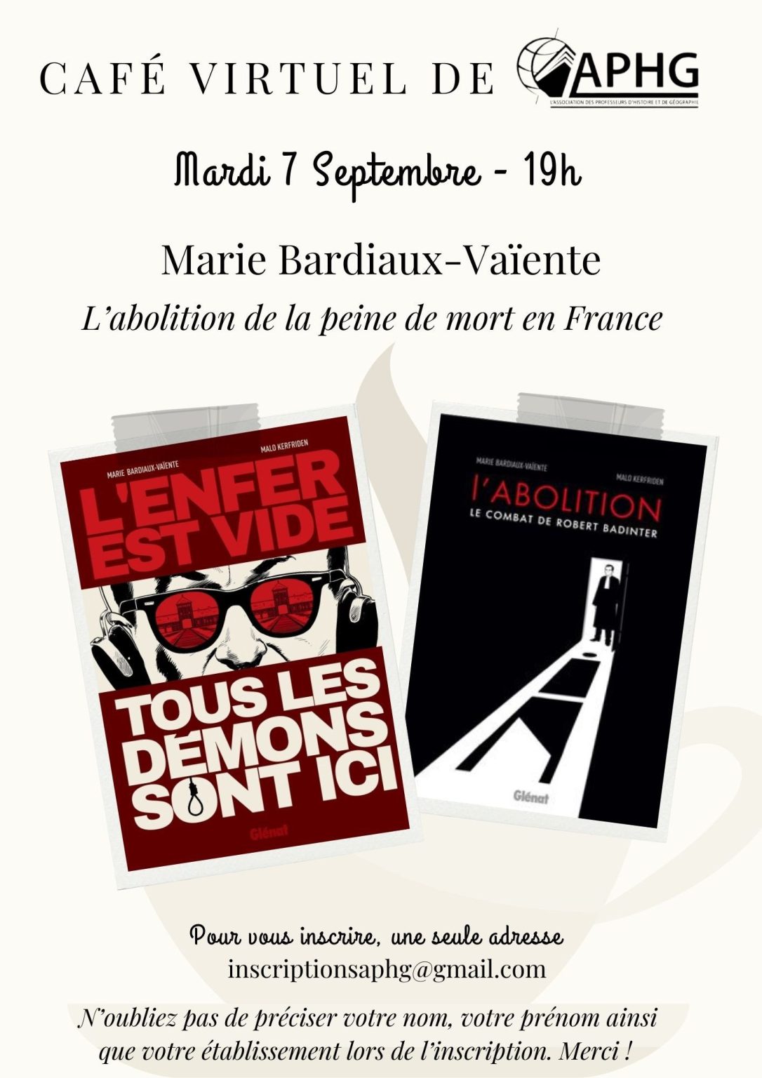 Le 7 septembre 2021, l’APHG Nord-Pas-de-Calais proposait une conférence de Marie Gloris Bardiaux-Vaïente, scénariste de la bande dessinée L’Abolition (Glénat, 2019), sur « L’abolition de la peine de mort en France ».