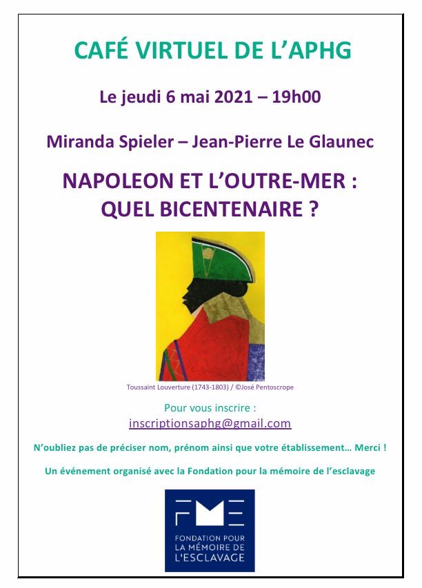 Le 6 mai 2021, en partenariat avec la Fondation pour la Mémoire de l’Esclavage, l’APHG recevait dans le café virtuel Miranda Spieler et Jean-Pierre Le Glaunec pour évoquer les relations entre Napoléon et l’Outre-Mer.