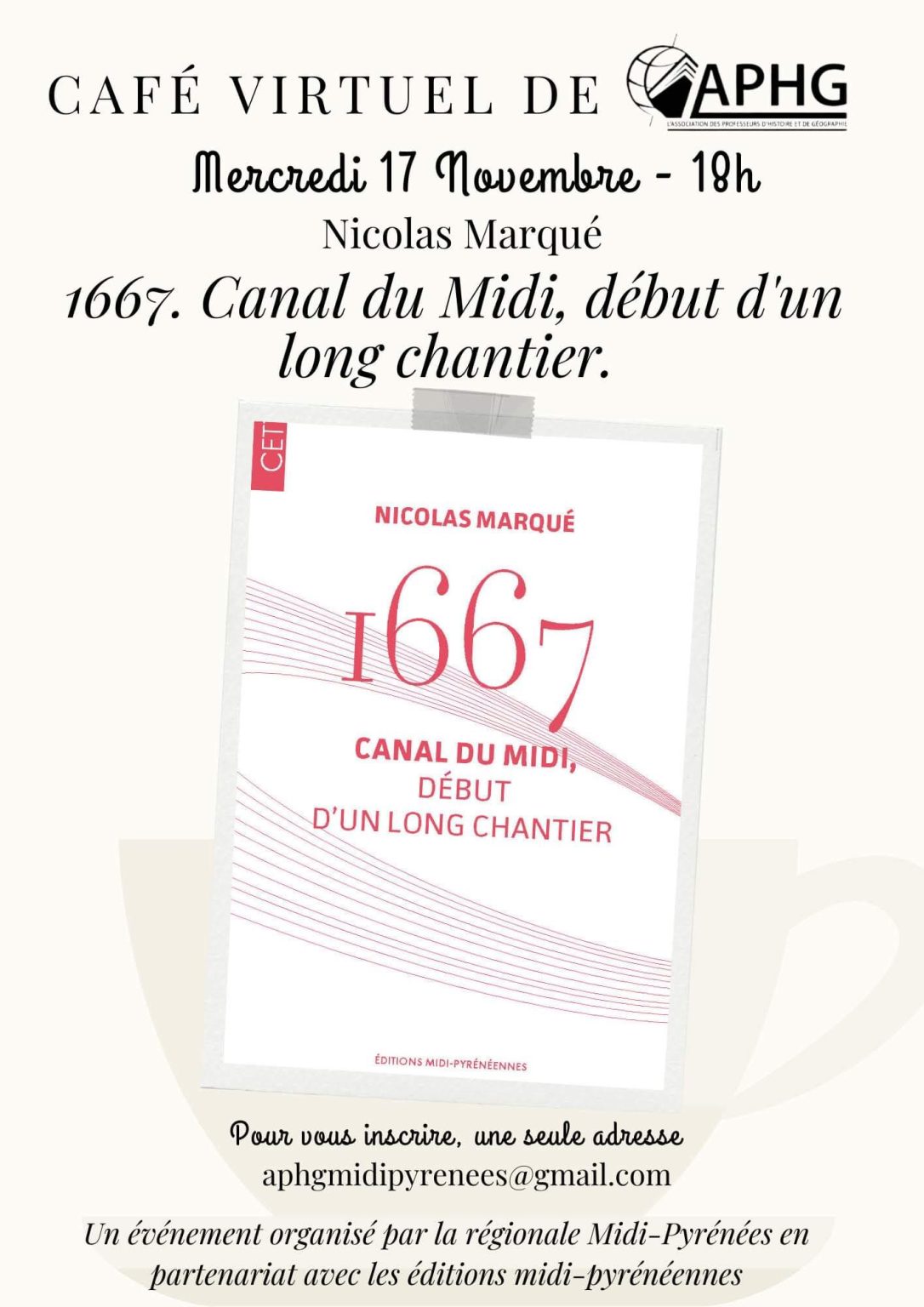 Le 17 novembre 2021, l’APHG Midi-Pyrénées recevait dans le café virtuel Nicolas Marqué, pour son ouvrage 1667. Canal du Midi, début d’un long chantier, paru aux Editions Midi-Pyrénéennes, dans la collection « Cette année-là à Toulouse ».
