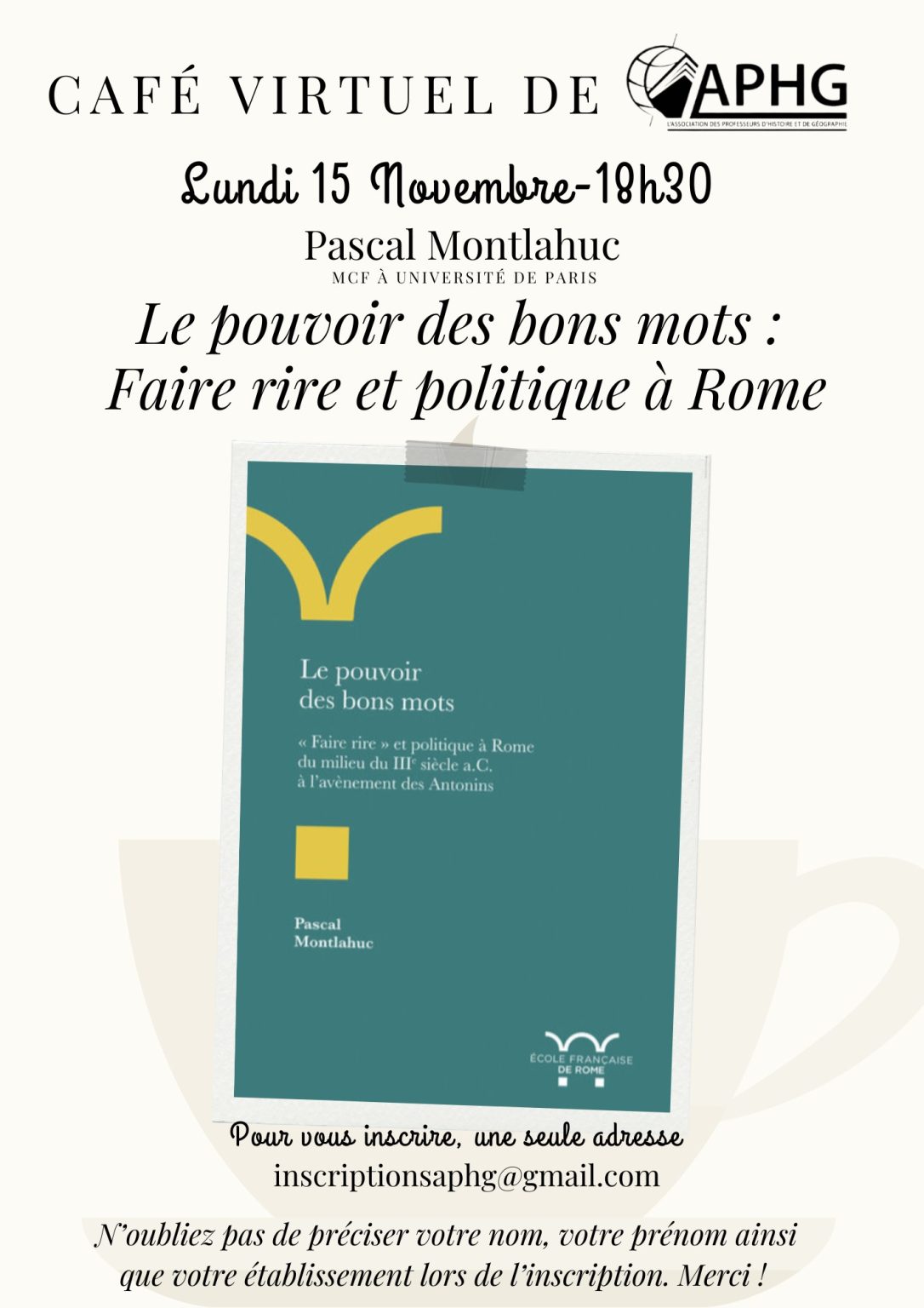 Le 15 novembre, le café virtuel recevait Pascal Montlahuc, pour son ouvrage Le pouvoir des bons mots : « Faire rire » et politique à Rome du milieu du IIIe siècle a.C. À l’avènement des Antonins, paru à l’Ecole Française de Rome.