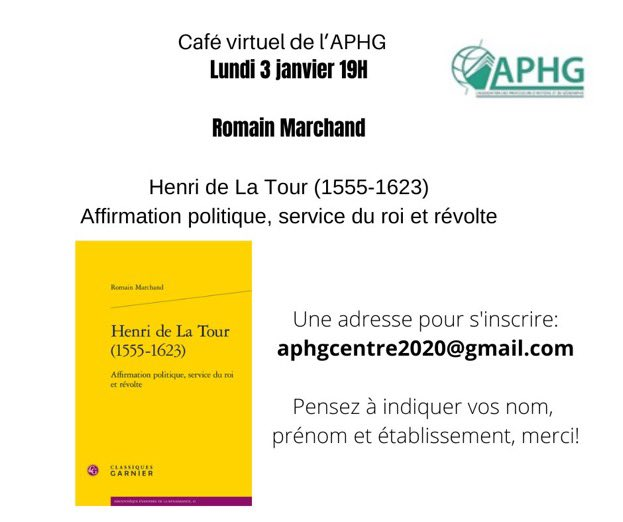 Le 3 janvier 2022, pour le premier café virtuel de l’année, l’APHG-Centre recevait Romain Marchand qui présentait sa biographie d’Henri de La Tour (1555-1623). L’échange était animé par David Feutry.