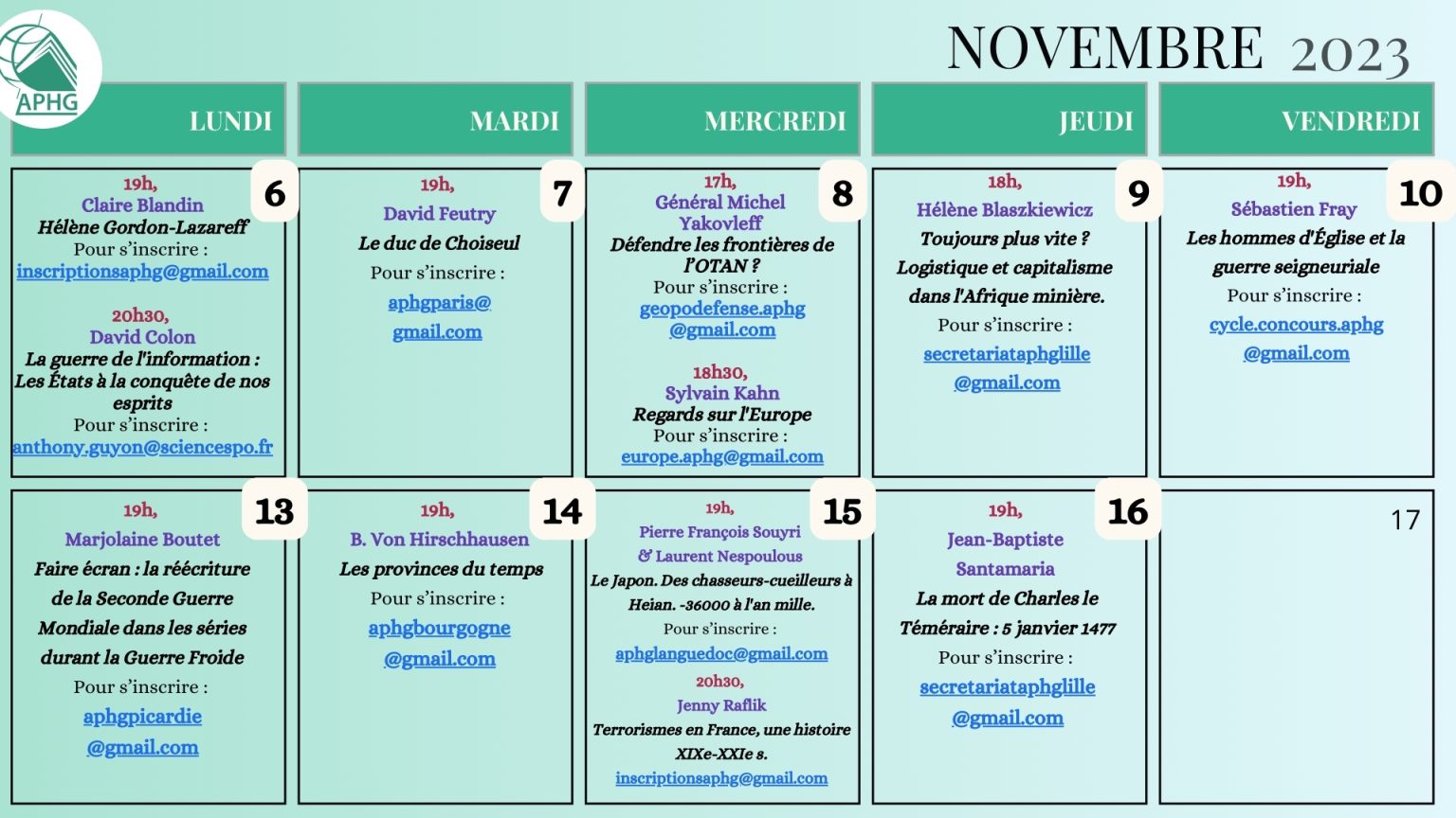 Si les membres de l’APHG sont bien sûr prioritaires pour ces diverses rencontres, vous y êtes toutes et tous les bienvenus pour apprendre, réfléchir et discuter avec nous, tous ensemble : n’hésitez pas à consulter fréquemment cette page !