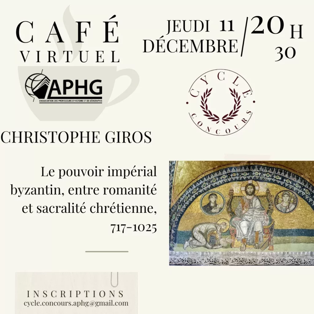 Le café virtuel a reçu Christophe Giros le 11 décembre 2025 pour aborder le thème : « Le pouvoir impérial byzantin, entre romanité et sacralité chrétienne (717-1025) ». Cette conférence s’inscrit dans le cadre du Cycle concours. Ce café – modèle hybride entre la visioconférence en public et l’entretien – est à retrouver en accès réservé aux adhérents et en version audio avec diaporama intégré pour protéger le droit à l’image des participants.