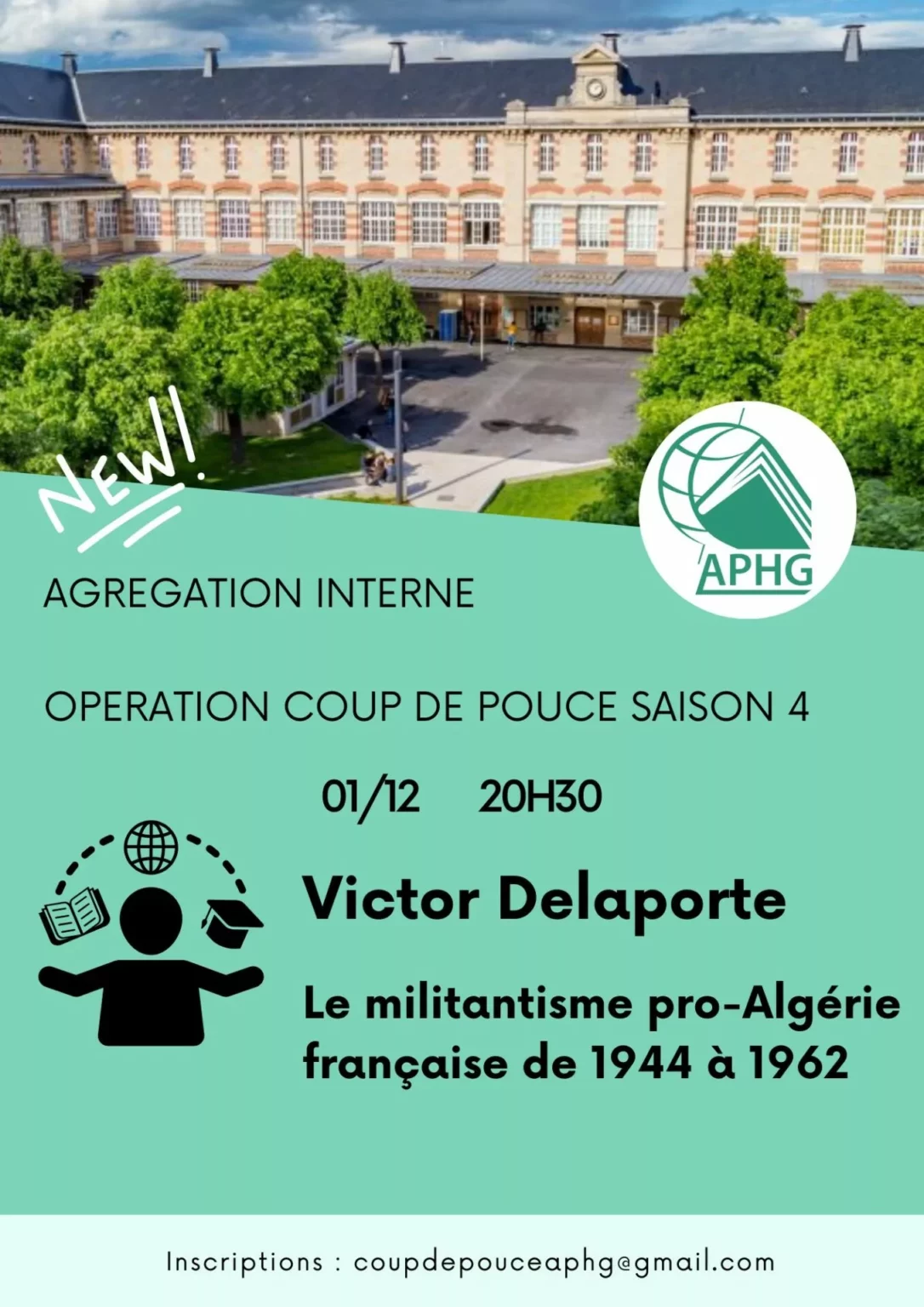 Opération coup de pouce pour préparer l’Agrégation interne organisée par l’APHG pour ses adhérents de l’année 2025-2026 sous la forme de conférences et de séances de méthodologie des épreuves. Vous pouvez retrouver sur cette page une séance de Victor Delaporte consacrée au thème « Le militantisme pro-Algérie française de 1944 à 1962 ». Le podcast est proposé en version audio. Pour vous inscrire au dispositif, une seule adresse : coupdepouceaphg@gmail.com