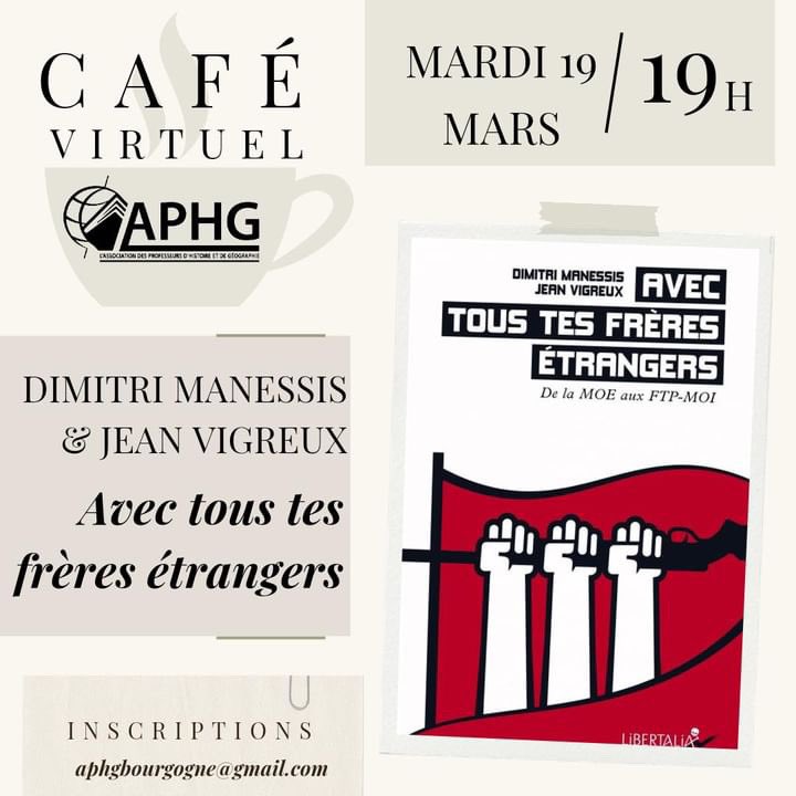 Le café virtuel a reçu Dimitri Manessis et Jean Vigreux le 19 mars 2024 pour la présentation de leur ouvrage Avec tous tes frères étrangers