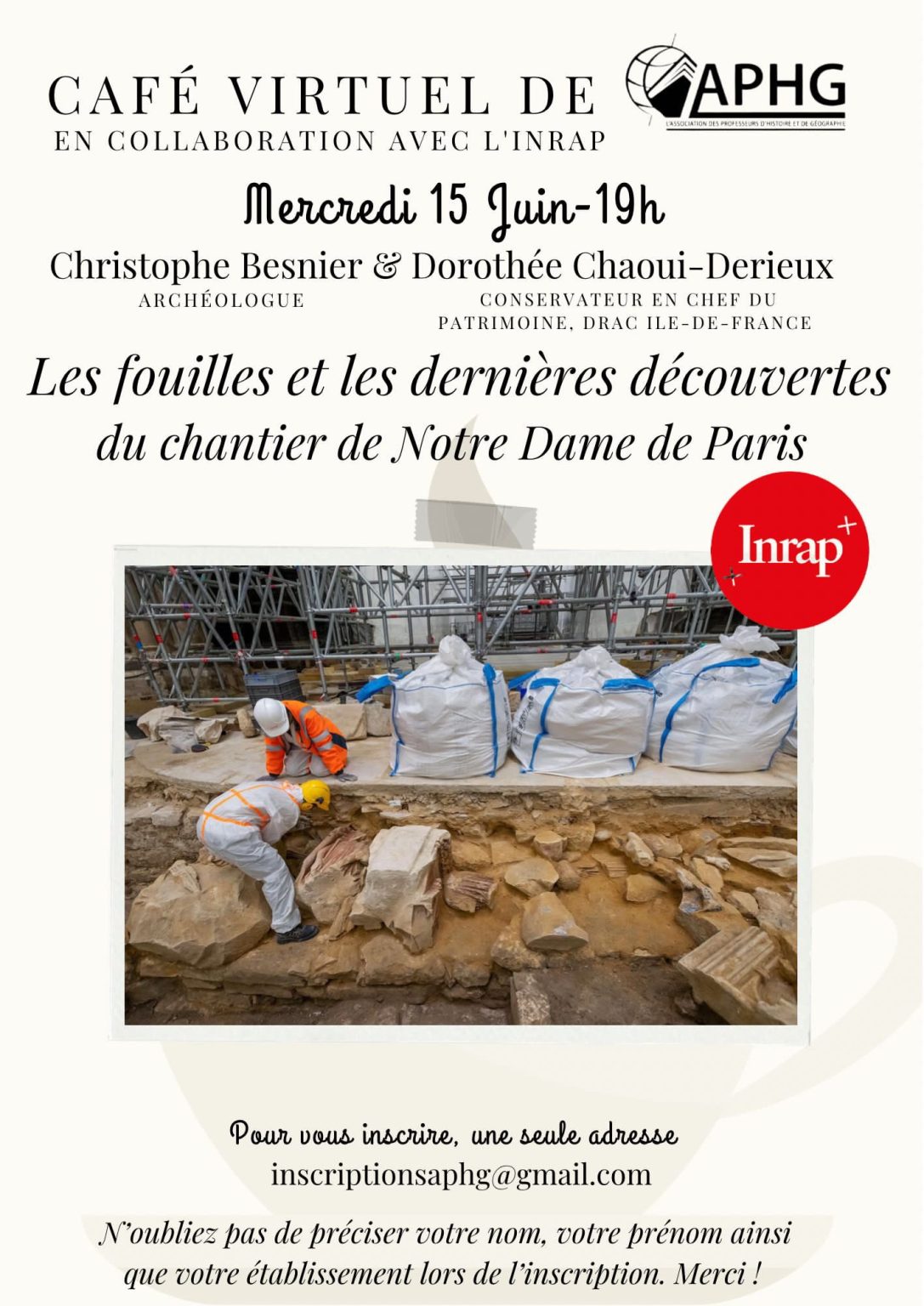 Le mercredi 15 juin 2022, en collaboration avec l’INRAP, Christophe Besnier, (archéologue) et Dorothée Chaoui-Derieux (conservateur en chef du patrimoine, Drac Ile-de-France) évoquaient les fouilles et les dernières découvertes du chantier de Notre-Dame de Paris. Les échanges étaient animés par Christophe Furon et Joëlle Alazard.