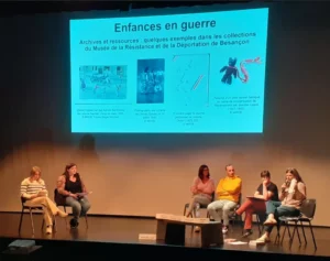La réflexion a été ouverte à travers une table ronde pour réfléchir sur comment enseigner la guerre à hauteur d’enfants à travers des acteurs et ressources locales. Pour cela la discussion menée par notre secrétaire Chloé GRUET, a montré quelques ressources du Musée de la Résistance et de la Déportation de Besançon, représenté par Cécile VAST (professeure dans le secondaire, chercheuse et conseillère scientifique du musée, trésorière de notre régionale), mis en parallèle avec des sources encore peu exploitée dans notre région, telle celles de la guerre pour les familles du voyage pour lesquelles. Sandrine GAMET (CASNAV) a expliqué avec justesse, la difficulté d’atteindre l’histoire des familles du voyage, et les projets possible autour de ces questions dans la région ayant eu un centre d’internement à Arc